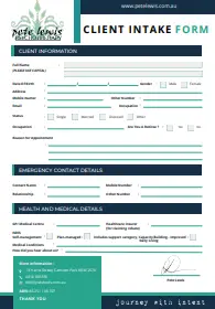 Please complete the client “Intake” and “Informed Content” forms prior to your first appointment . Forms are available online (preferred) or you can download a hard copy to print off, scan and return via email (info@petelewis.com.au).